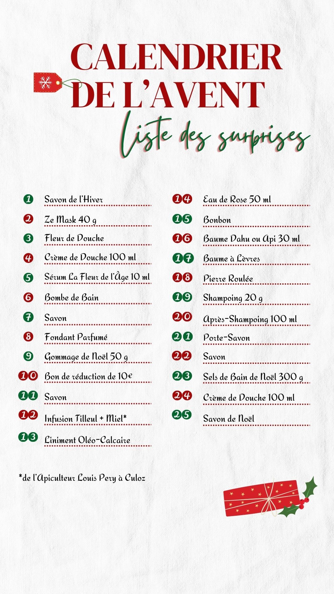 Découvrez chaque matin votre surprise quotidienne jusqu'au 25 décembre. Nos cosmétiques naturels surgras se conservent parfaitement grâce à leur composition artisanale. Parfait en cadeau ou pour s'offrir des fêtes authentiques. Expédition prévue avant le 20 novembre, avec livraison gratuite en point relais (Mondial Relay ou Colissimo) et Mondial Relay à domicile disponible.
